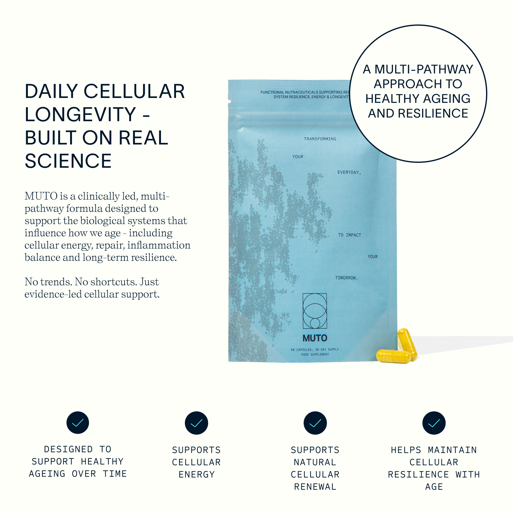 MUTO supports the body’s core systems involved in energy, recovery and long-term health. By helping maintain efficient cellular function, it supports everyday energy, resilience and healthy ageing.