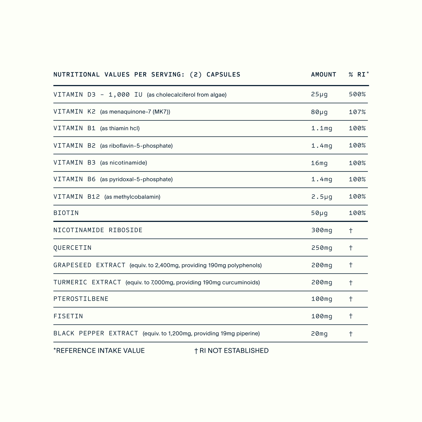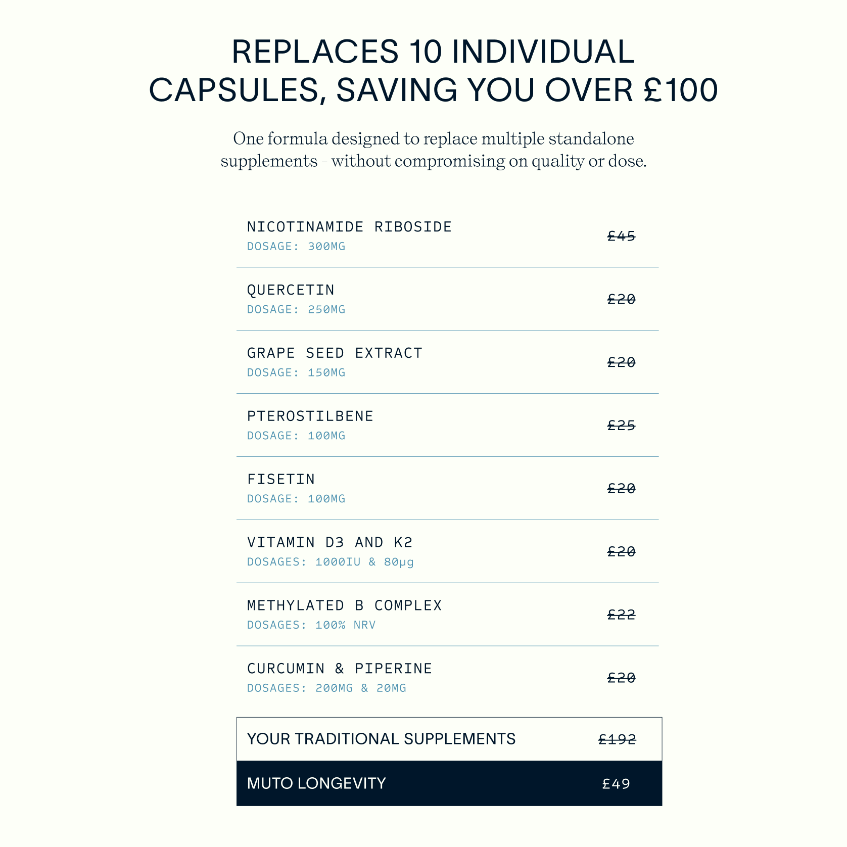 MUTO Longevity contains 10 clinically backed, scientifically dosed and fully traceable ingredients, individually tested for their authenticity and quality. The ingredients are: Nicotinamide Riboside Chloride, Pterostilbene, Grape Seed Extract, Fisetin, Quercetin, Curcumin, Piperine, Vitamin D3, Vitamin K2and a methylated Vitamin B Complex.