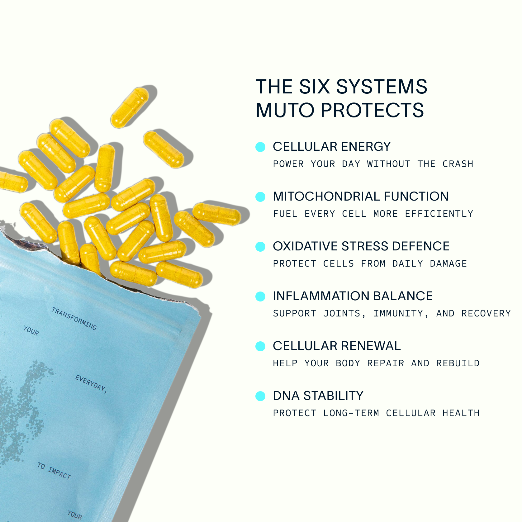 MUTO supports the core cellular systems that decline with age - helping your cells produce energy, repair damage, and stay resilient over time.