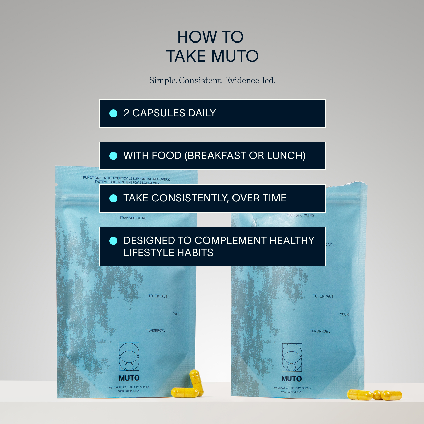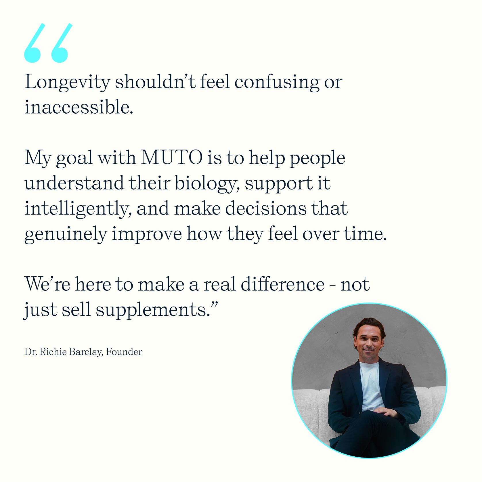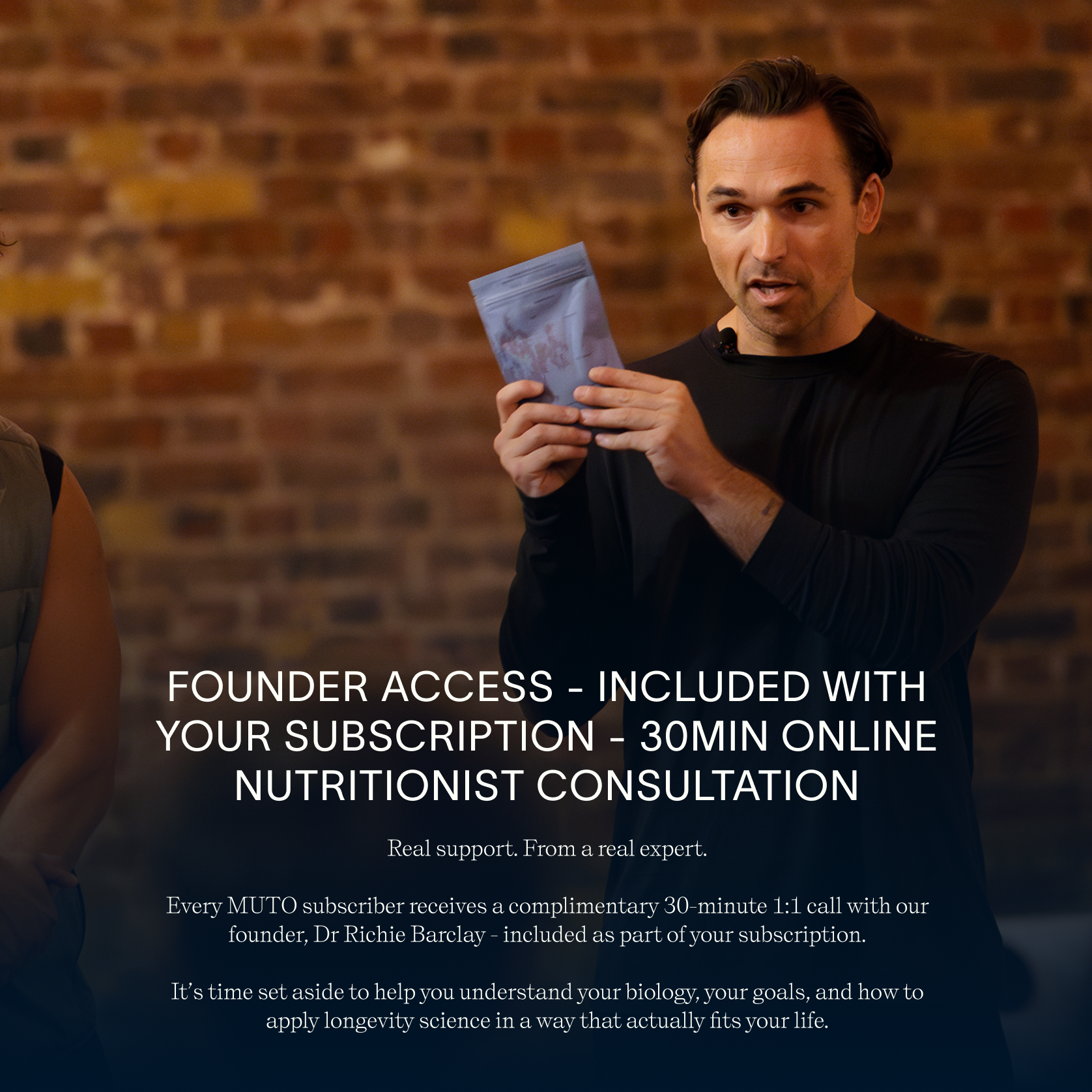 Formulated by Dr Richie Barclay, PhD in Longevity Nutrition, MUTO translates complex science into a simple, daily nutraceutical that supports performance, focus and recovery in a meaningful way.